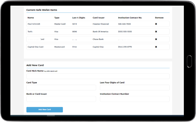 Safe Wallet offers simple access to these important numbers, along with the phone to numbers to call to restore the accounts.